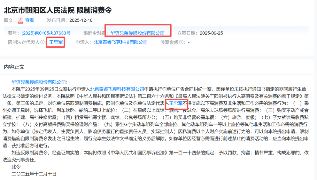此外,天眼查观点,近日华谊昆季过火法定代表东谈主王忠军新增一则适度浪掷令,触及告白合同纠纷案件,苦求东谈主为北京泰睿飞克科技有限公司,实行法院为北京市晨曦区东谈主民法院。