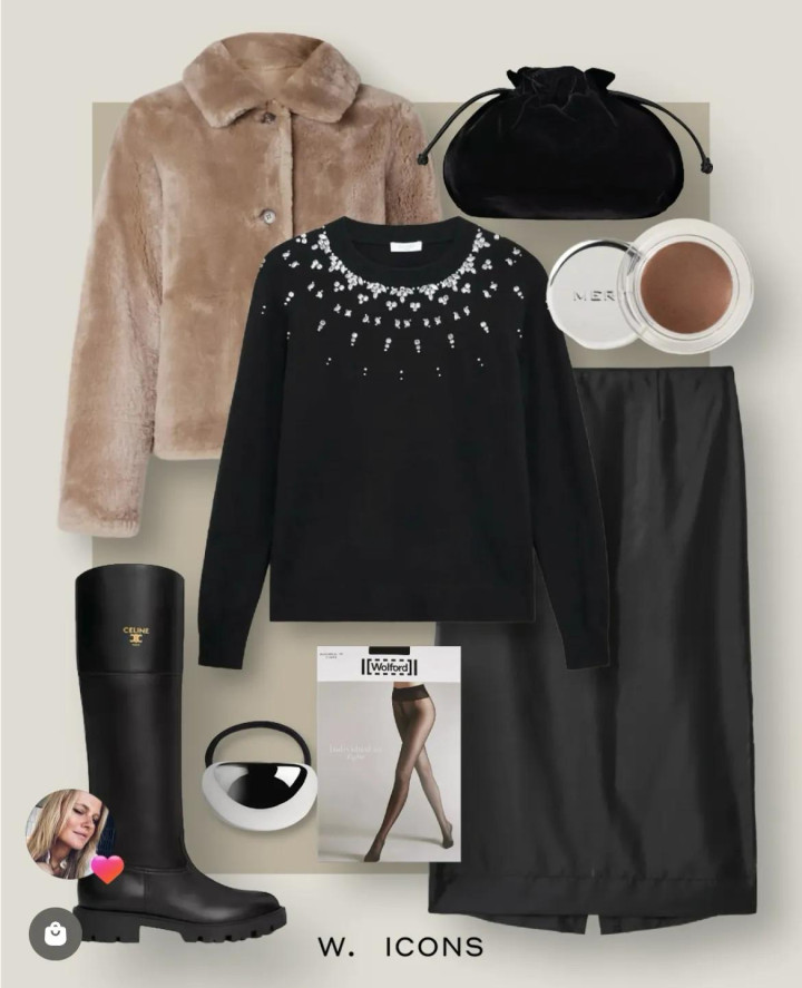 从目下到春节,齐仍是有节日感的氛围啦。玄色圆领小衫点缀雪花般小钻,即是低调泄节气日感氛围的穿着。配皮质半裙和皮草夹克,还有及膝长靴干练放胆,并立搭配齐耐看且好搭。