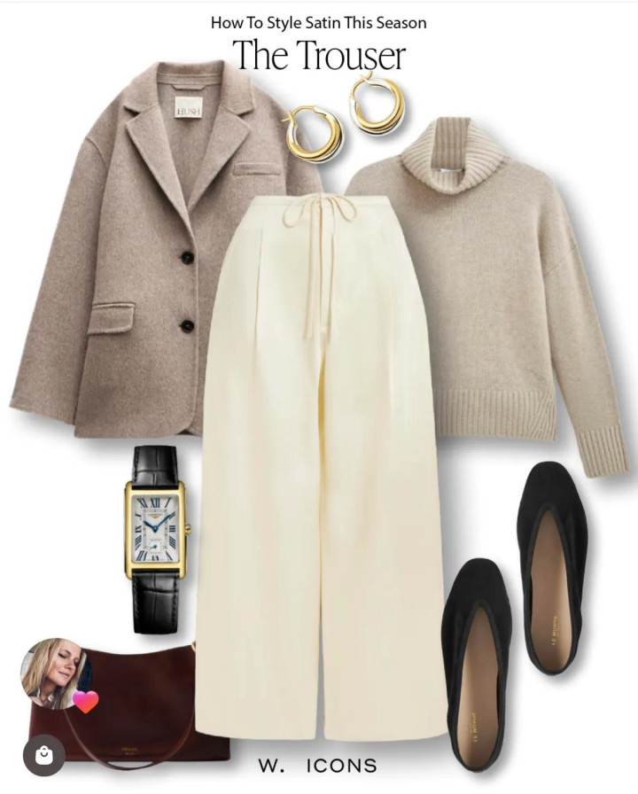 高腰阔腿裤遭逢奶油白,总能在隆冬穿出亮堂感。配米色毛衣的柔滑,连西装也换成软羊毛的质感,保留了概述感又很温和,把冬日的情切穿在身上。