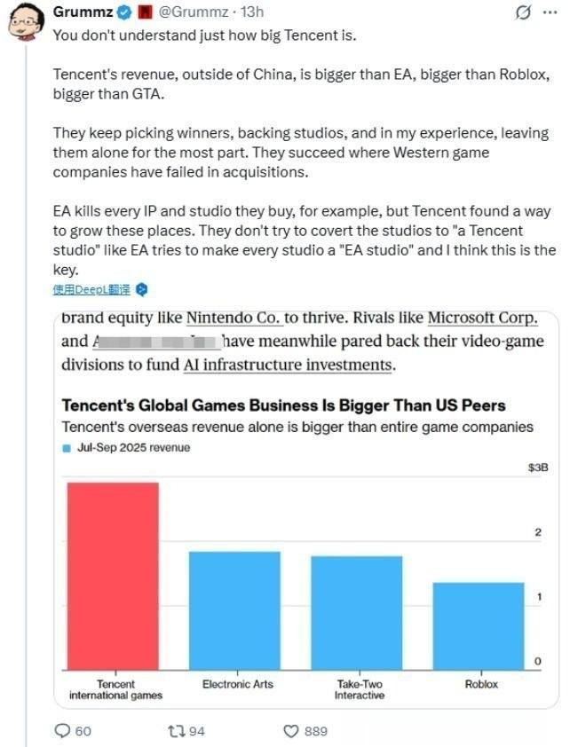 腾讯取得群众首富的笃定,马斯克发文夸赞,直言他们的试吃很好,当寰宇首富马斯克也初始为腾讯“试吃好”点赞,这背后的真谛,远比一句夸奖更值得玩味,近日,前《魔兽寰宇》制作主说念主、暴雪老兵Mark Kern(Grummz)在应付平台上共享了他对腾讯游戏业务的不雅察,激发国际公论热议,他指出一个很多东说念主忽略的事实——腾讯在国际市集的收入规模,如故罕见EA、Roblox以至《GTA》系列的阐扬。