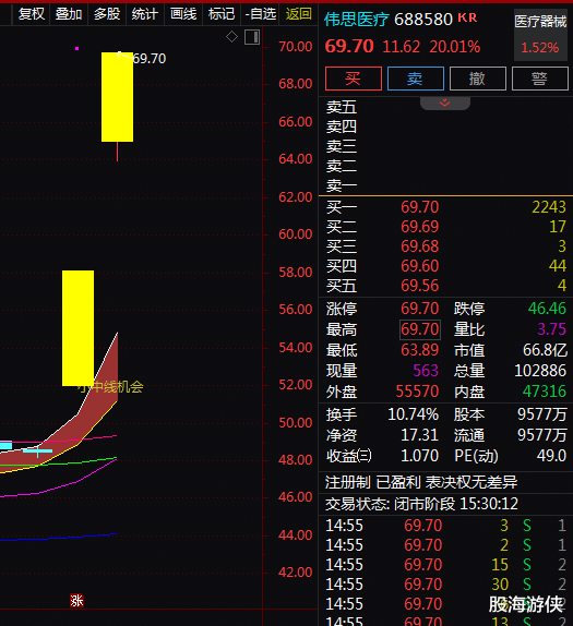 从时刻面上来看,伟想医疗(688580)该股在板块的带动下,2天2板!2个交游日股价高潮了44%!均线呈现多头罗列,MACD有赓续上扬的能源,主力资金净流入149.6万元。