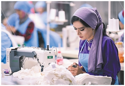 2025年9月12日,在塔吉克斯坦哈特隆州丹加拉区,别称工东谈主在中塔合营神色丹加拉农业纺织产业园裁缝车间职责。