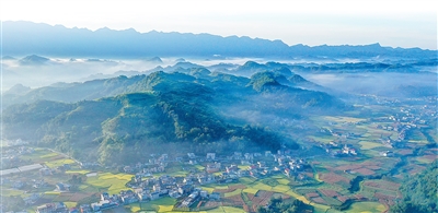 湖南湘西土眷属苗族自治州龙山县召市镇晨雾缭绕,好意思不堪收。