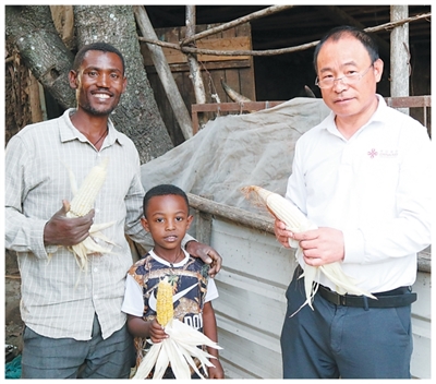 2025年11月26日,在埃塞俄比亚奥罗米亚州的戈迪诺村,中国援埃塞俄比亚第四期高档农业行家组副组长刘守云(右)与村民阿布·内加什(左一)展示新收成的玉米。